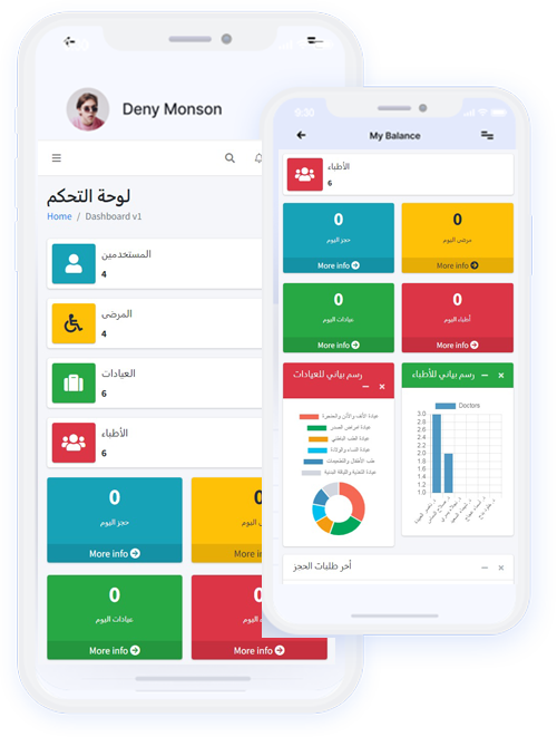 لوحة تحكم شاملة لإدارة الموقع : لوحة تحكم شاملة لتعديل جميع خصائص الموقع و مراجعة الستخدمين و ضبط مواعيد الأطباء و تشمل تقارير و رسوم بيانية.